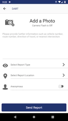 * The “Report an Incident” button allows users to send text or photos directly to Dallas Area Rapid Transit. To ensure discretion, the camera flash is automatically disabled when photos are taken through the app. When reporting an issue, users can select locations and report categories. Riders can also send reports anonymously if they choose.