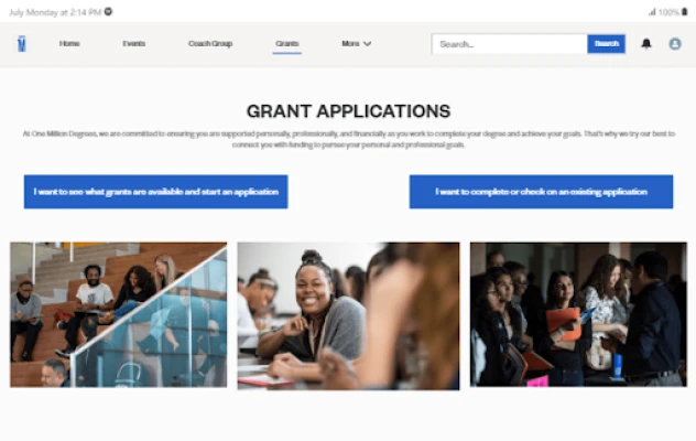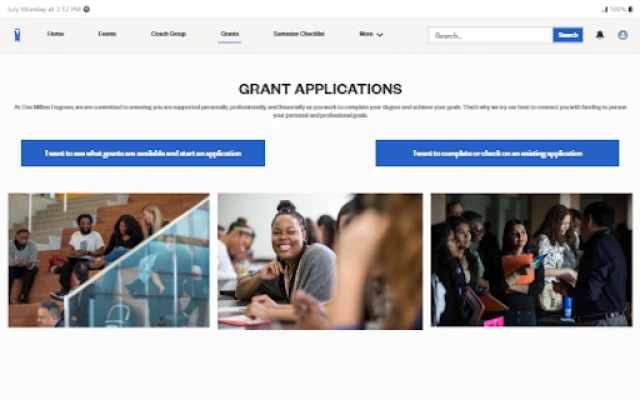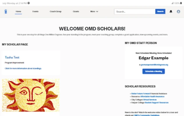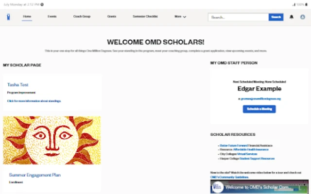 Coaches and scholars can view their coach group, upcoming events, and relevant resources. Scholars can use the app to apply for grants, access all payment records, view performance on evaluation rubrics, and more.