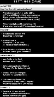 + Settings: Various options are available to alter the look of the gaming experience: Change difficulty level, hexagon size, Animation speed, choose icon set for units (NATO or REAL) and cities (Round, Shield, Square, block of houses), decide what is drawn on the map, and much more.