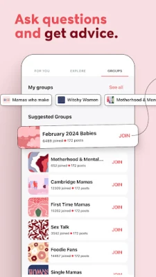 🤔 Ask: Seek advice on baby names, baby sleep, and more from your new mom friends.